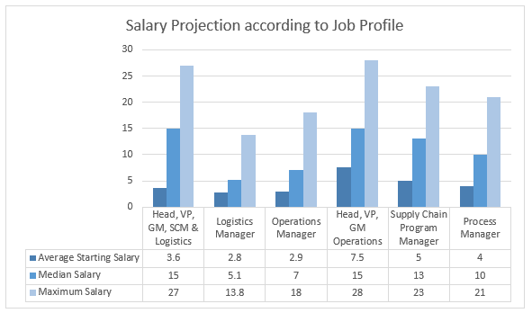 There are multiple job roles associated with MBA in Operations Management and the salary trend varies according to these roles and responsibilities associated. Below is a graph charting the minimum, median and maximum salaries for various roles.